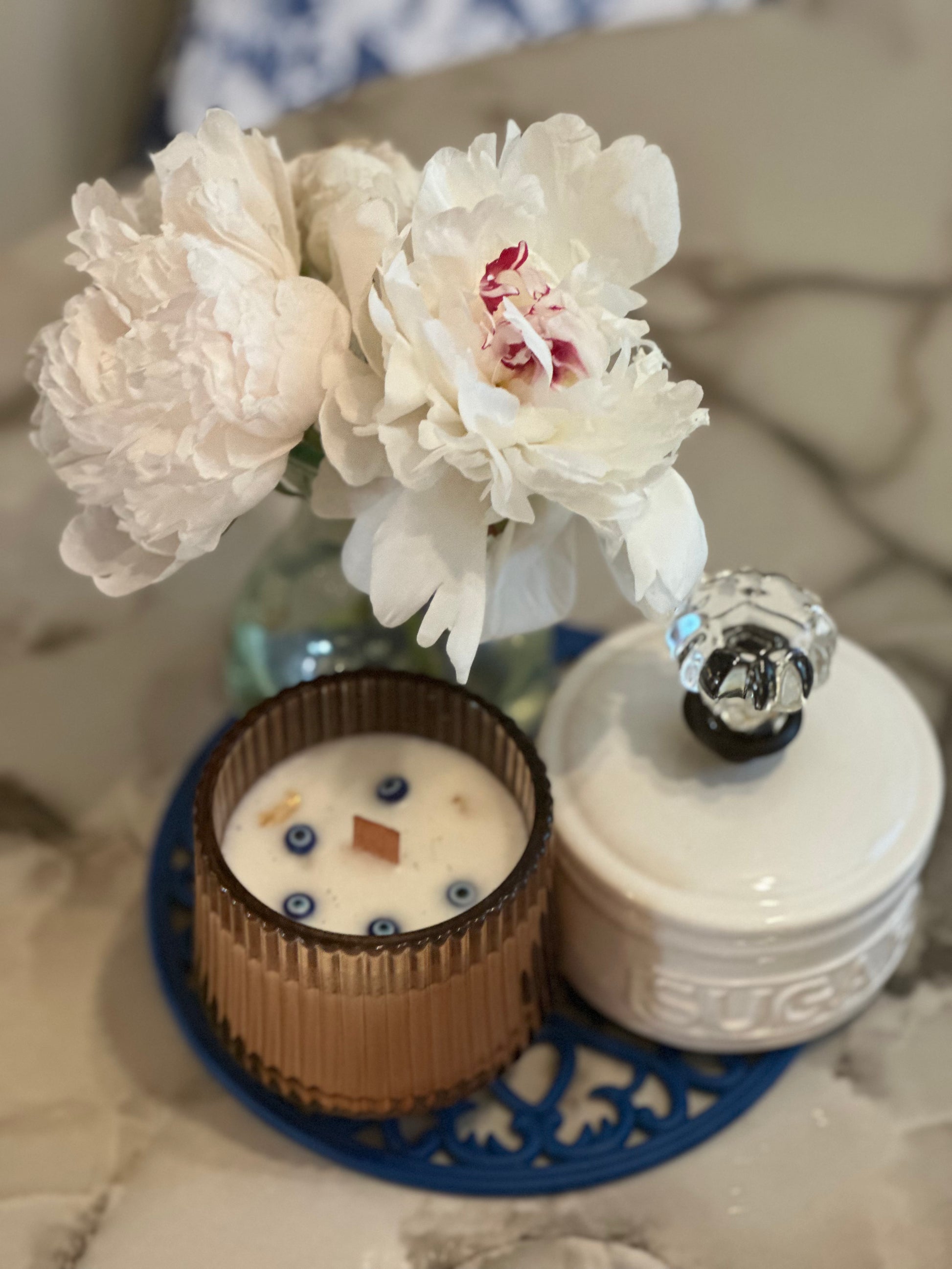 Ingredients: Coconut blend wax, wooden wick, essential oil blend of white peony, amber, and sandalwood, evil eye charms, black tourmaline crystals, gold flakes